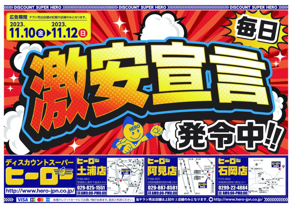 「毎日激安宣言」11月10日(金)~11月12日(日) ヒーロー土浦店・阿見店・石岡店にて開催!