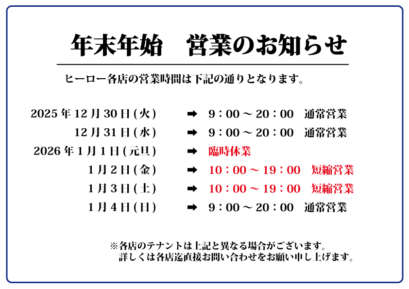 年末年始 営業時間のお知らせ