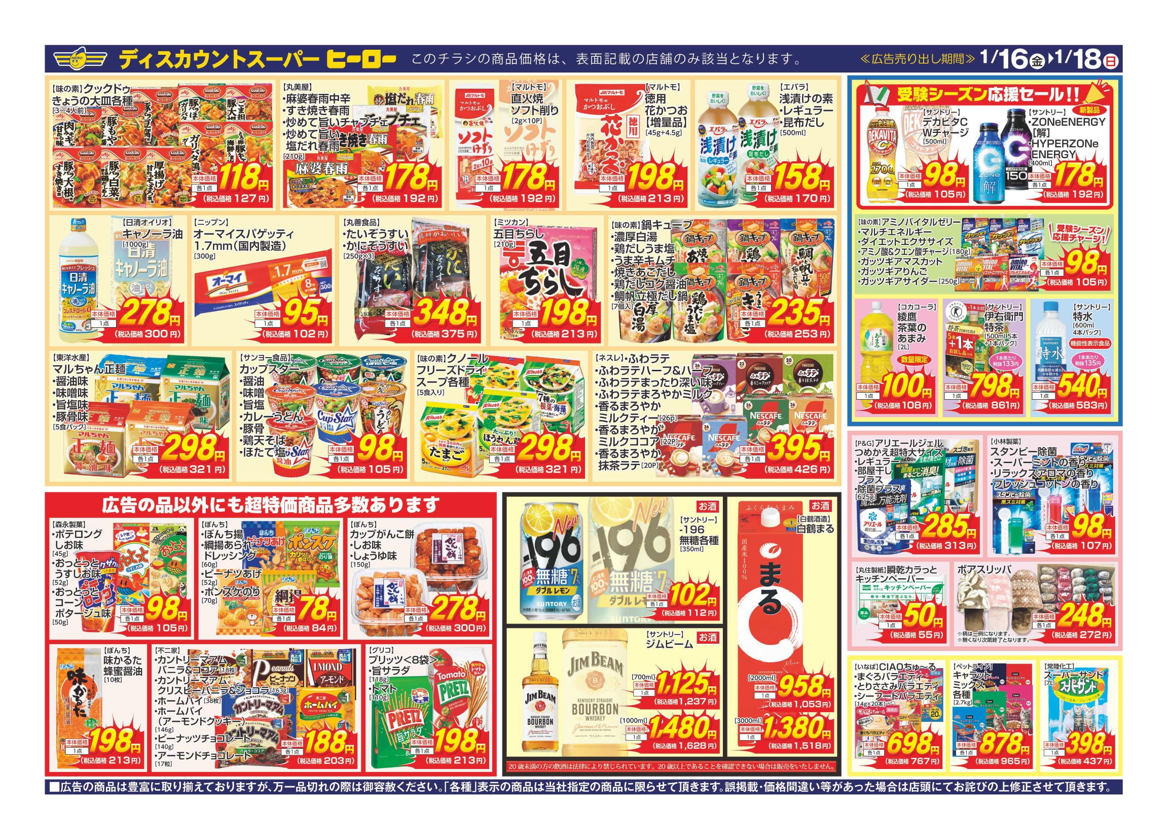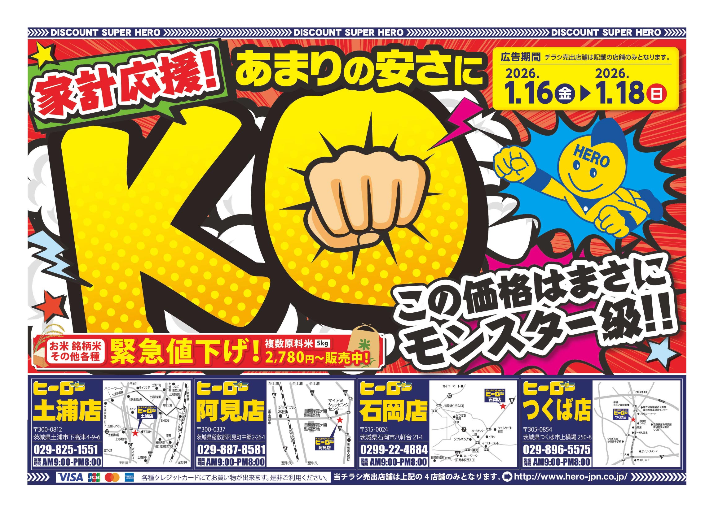 「家計応援!あまりの安さにKO!」1月16日(金)~1月18日(日) ヒーロー土浦店・阿見店・石岡店・つくば店・下館店・水戸双葉台店にて開催!